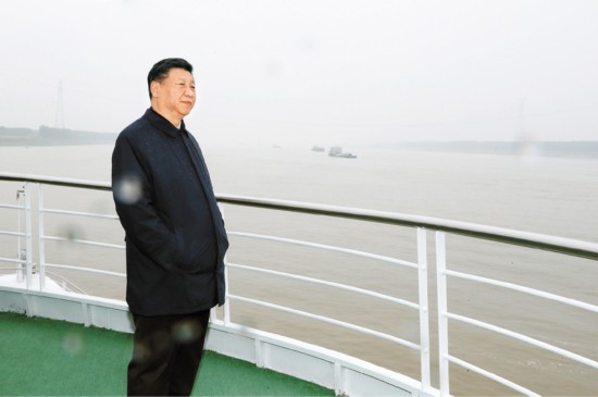 2018年4月26日下午,中共中央总书记、国家主席、中央军委主席习近平在武汉主持召开深入推动长江经济带发展座谈会并发表重要讲话。这是座谈会前,习近平于25日上午乘船沿江察看两岸生态环境和发展建设情况。 新华社记者 谢环驰/摄